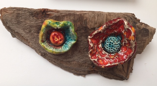 Fleurs céramique sur bois flotté Vendu