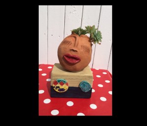 Tête à plante en terre cuite, émaillée sur support en bois. 50 euros