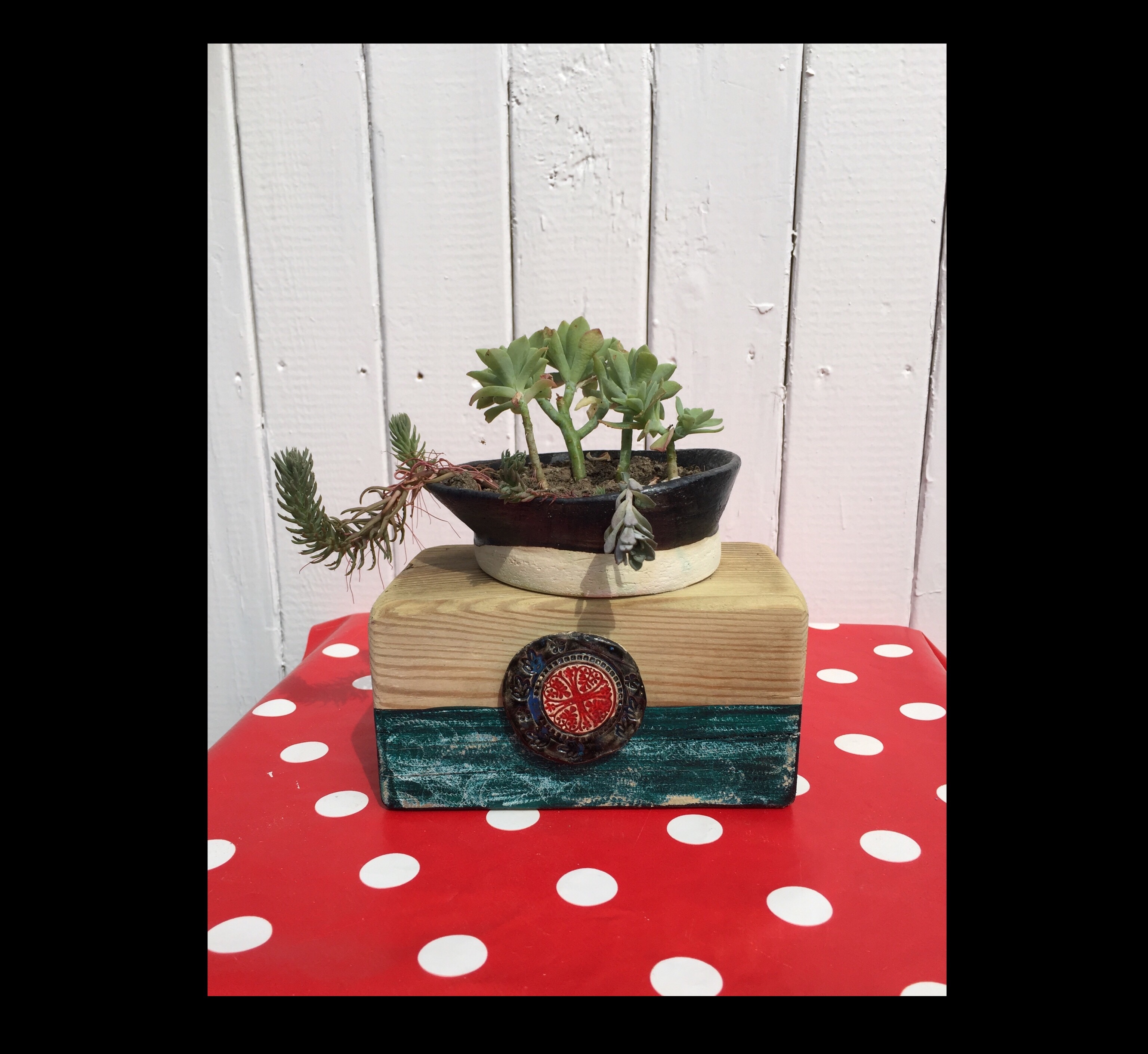 Pot en terre cuit, émaillé sur support en bois. 25 euros