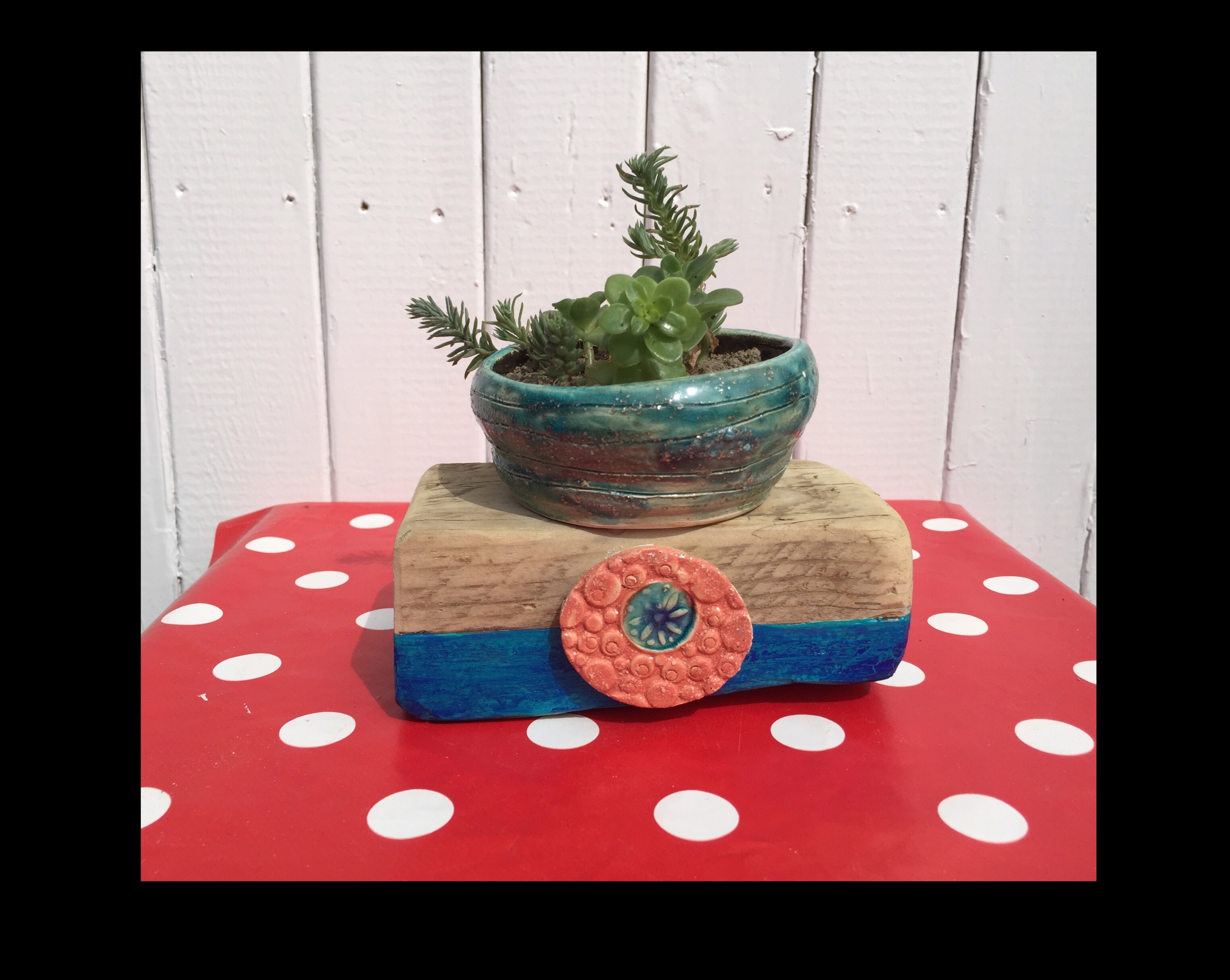 Pot en terre cuit, émaillé sur support en bois. 25 euros
